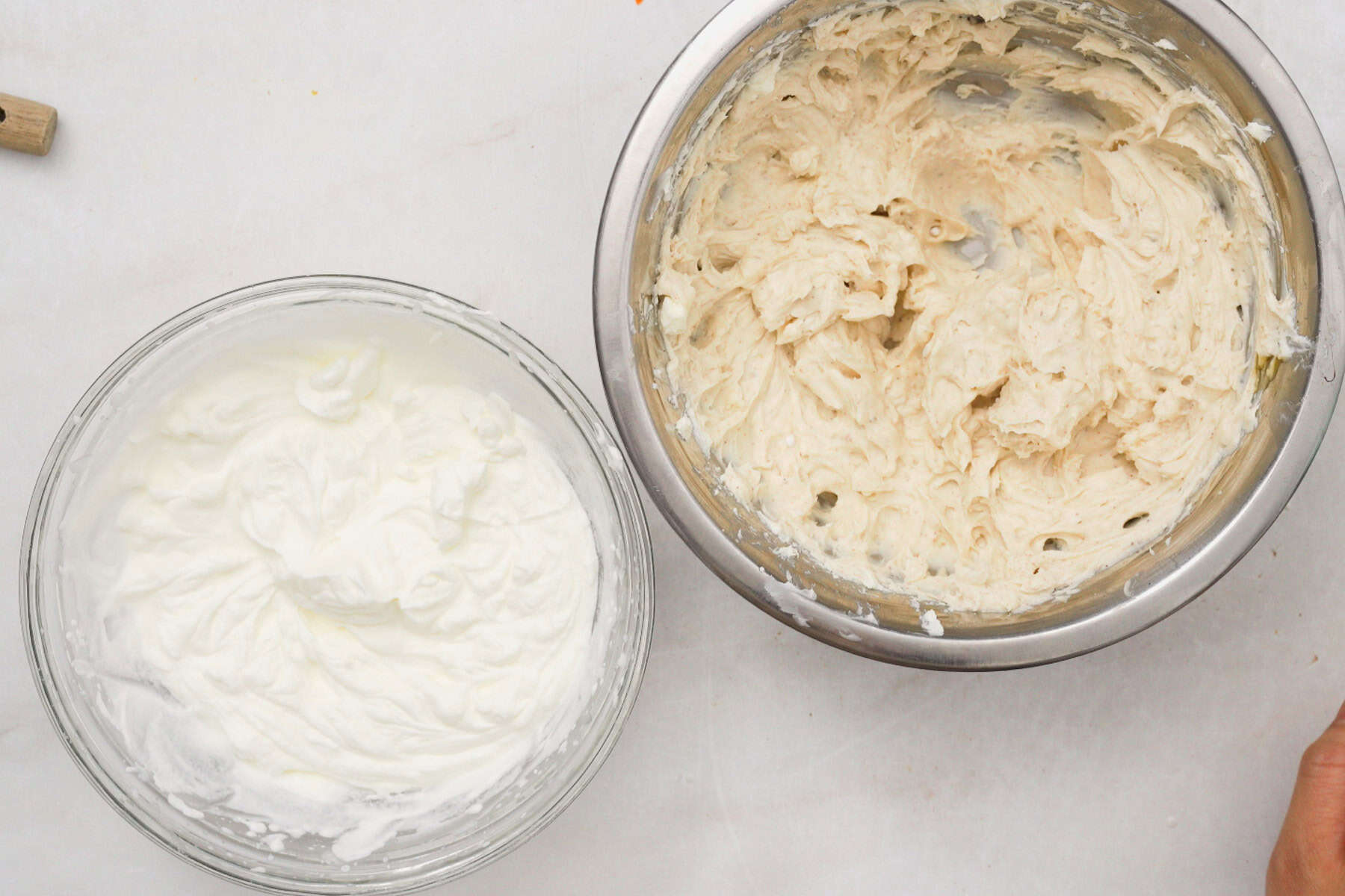 - Beat room temperature cream cheese and butter until smooth. Add maple syrup and pumpkin spice and mix until combined. In a separate bowl, whip the heavy cream until stiff peaks form. Gently fold the whipped cream into the cream cheese mixture until smooth and fluffy.