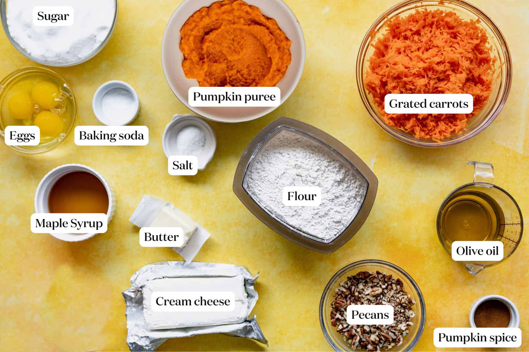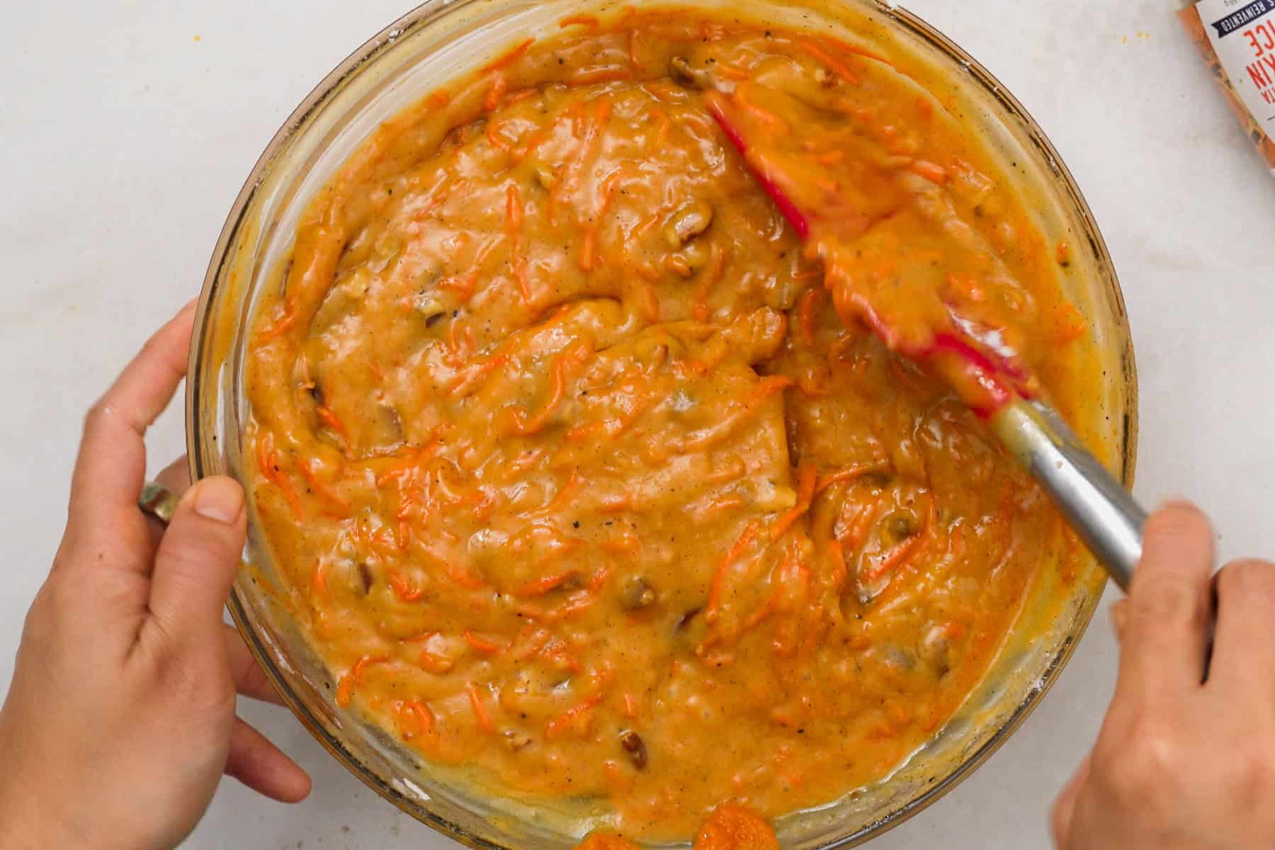 - In a large bowl, whisk eggs, olive oil, granulated sugar, and vanilla, pumpkin puree until well combined. Add the dry ingredients to the wet ingredients and fold gently until just combined. Fold in the grated carrots and pecans.