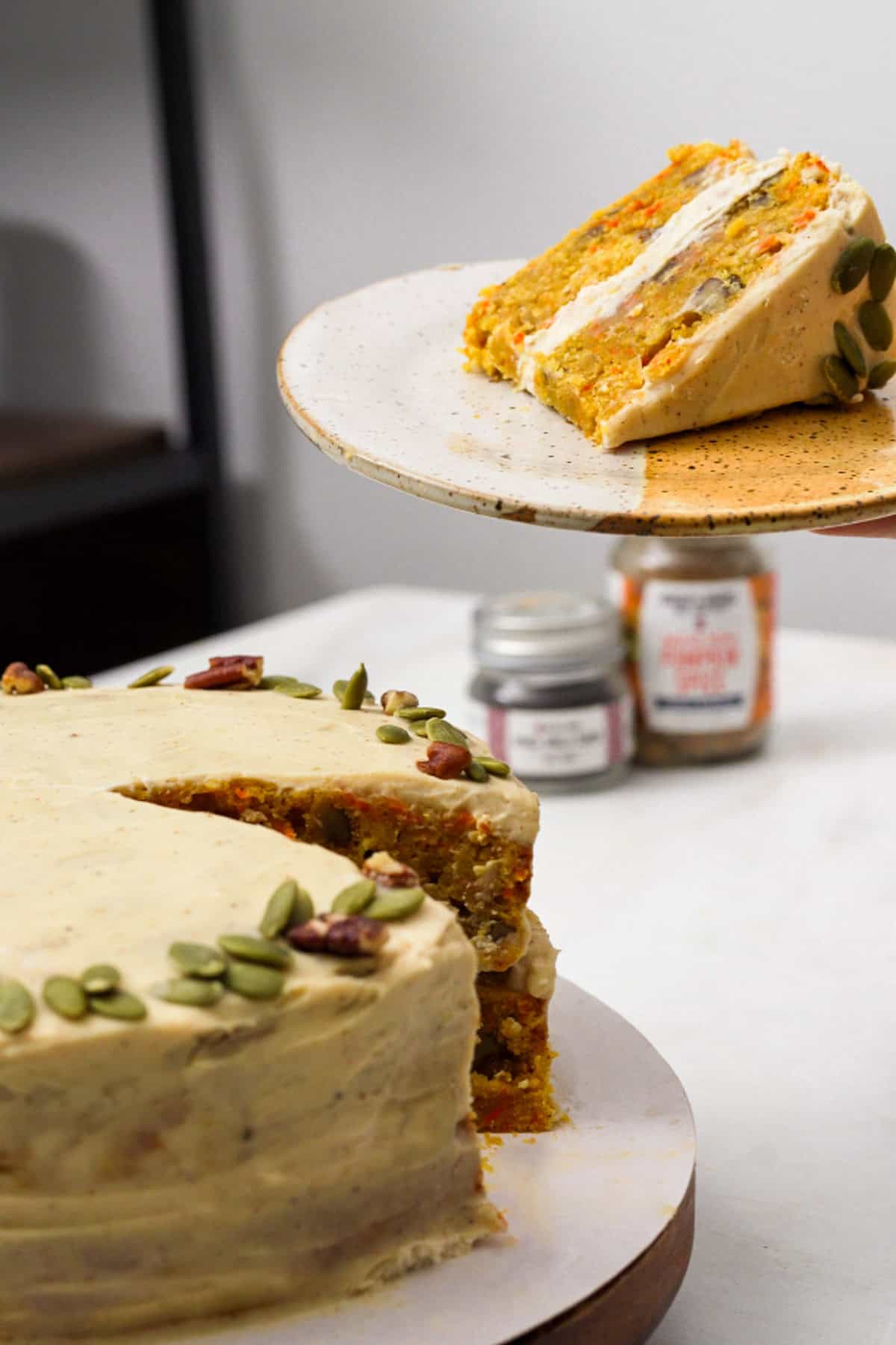 - Storage: This cake stays moist for days thanks to the pumpkin and carrots! Store leftovers in an airtight container in the refrigerator for up to 5 days. I actually think it tastes even better the next day when the frosting settles and the flavors have had time to develop.