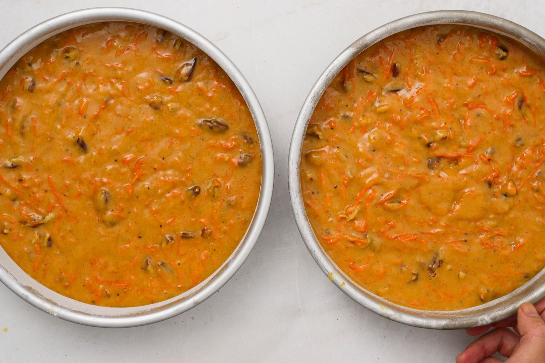 - Divide the batter evenly between the prepared pans. Bake for 30-40 minutes, or until a toothpick inserted into the center comes out clean with a few moist crumbs. Allow cakes to cool in the pans for 10 minutes, then turn out onto wire racks to cool completely.