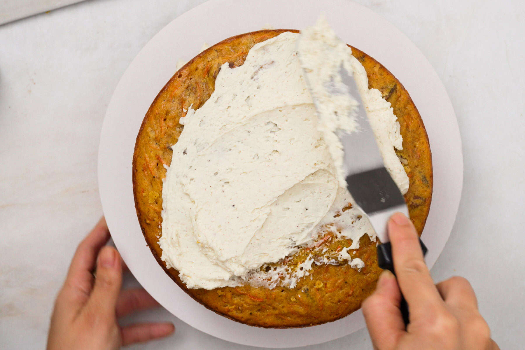 - Place one cake layer on a serving plate. Spread about 1 cup of frosting over the top. Place the second layer on top and frost the top and sides of the cake. Garnish with chopped pecans or pumpkin seeds if you want. Refrigerate for at least 30 minutes before serving to allow the frosting to set.